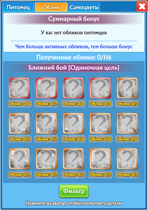 Здесь вы сможете увидеть всех доступных в данный момент питомцев и количество доступных для них обликов. Каждый открытый для любого питомца облик дает всем вашим бойцам дополнительные характеристики.