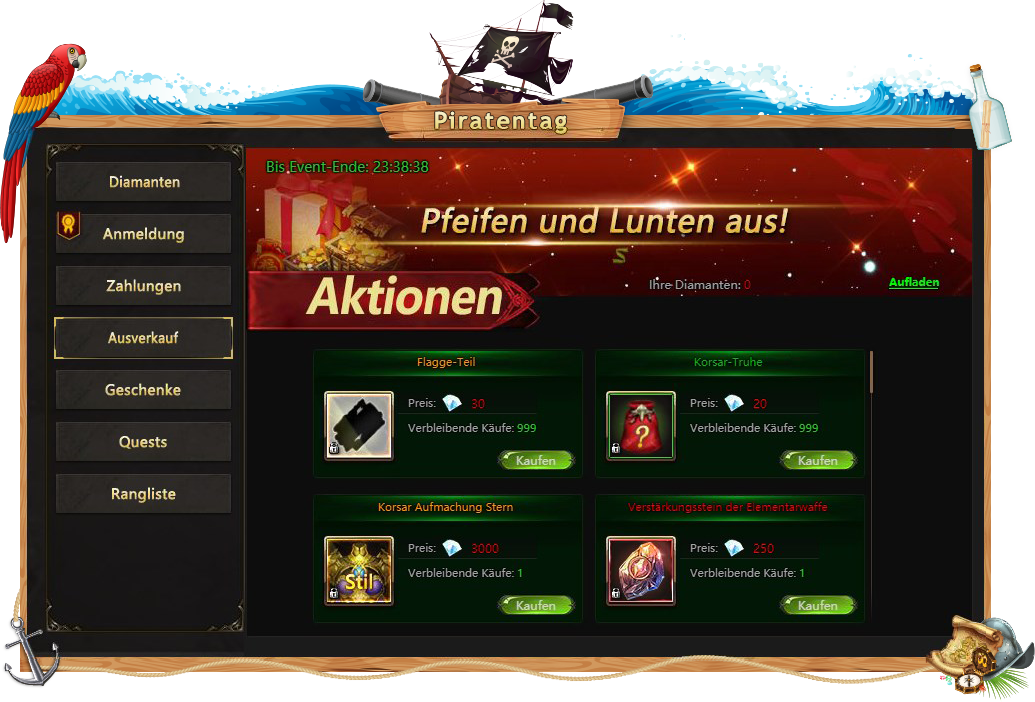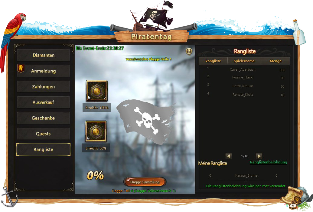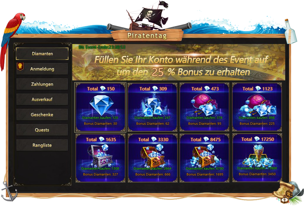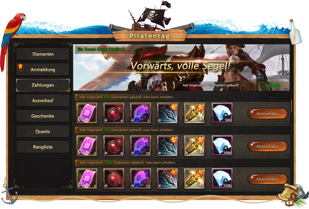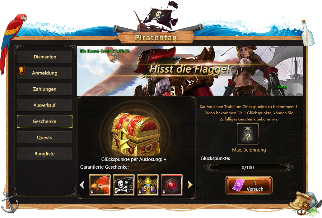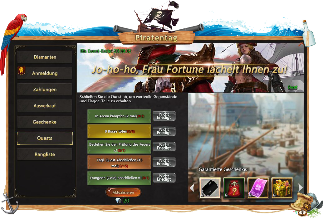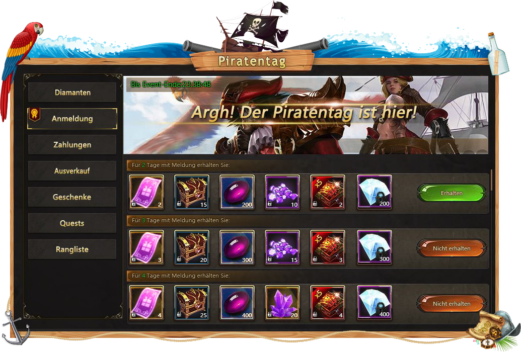 Anmeldung - besuchen Sie Piratentag Fest taglich und bekommen verschiedene Belohnungen;