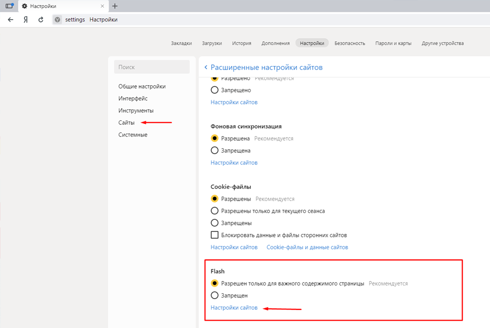 2. Выберите "Сайты", пролистайте до пункта Flash и выберите "Настройки сайтов":