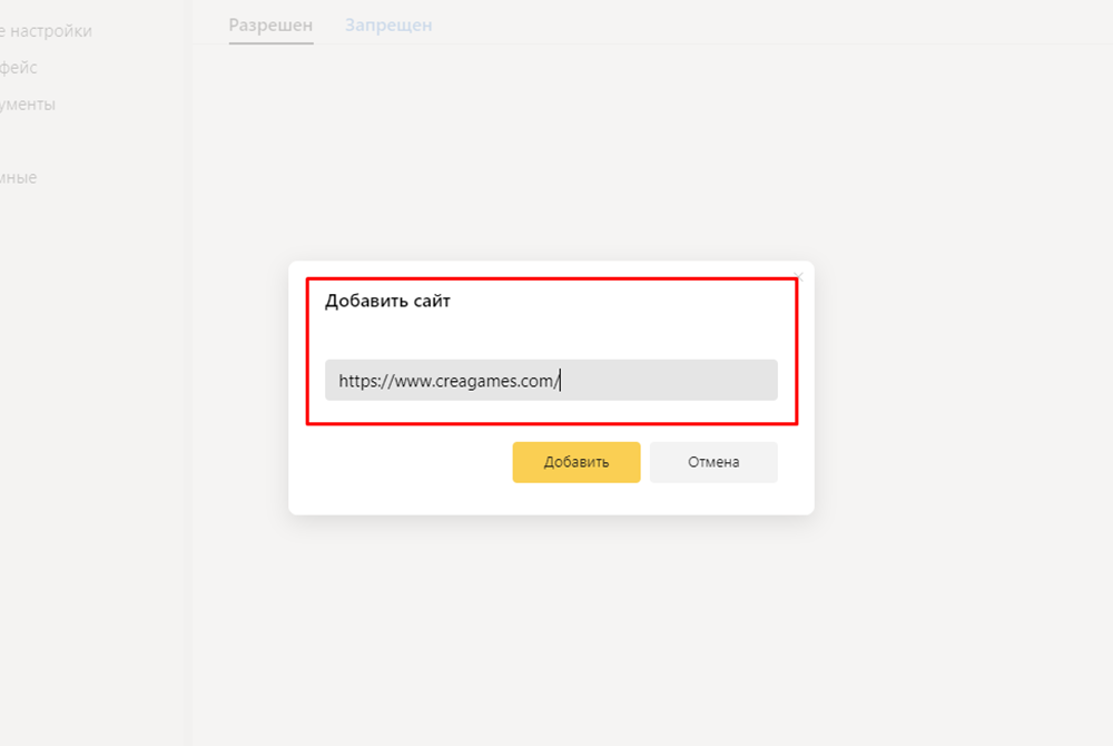5. Введите адрес нашего сайта https://www.creagames.com в поле и нажмите "Добавить":