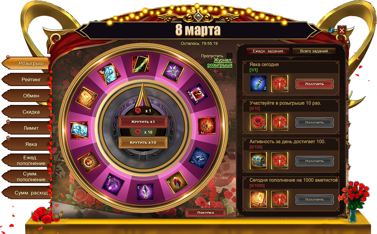 За пополнение счета на определенное количество аметистов за один день, вы можете получить: Изумруд, Сундук кристаллов 5 ур., Сундук камней элементаля 4 ур., Сундук самоцветов 6 ур., Цветок богини, Бант, Дух крыльев святости, Сундук кристаллов 7 ур., Сундук кристаллов 9 ур., Сундук с эссенцией стигмата, Сущность артефакта, Сундук редкостей, Сундук самоцветов 8 ур., Сундук с кодексом, Фрагмент голубого пера, Письмо с молитвой, Простой горн, [Фрагмент карты] Тюр.