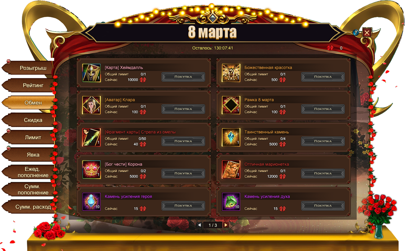 Банты, собранные во время данного Фестиваля, позволяют приобрести множество интересных предметов, в том числе и эксклюзивных для данного события: [Карта] Хеймдалль, титул Божественная красотка[Аватар] КлараРамка 8 марта. Если эксклюзивные предметы вас не интересуют, всегда можно обменять Букеты на полезные ресурсы. Например, на Отличная марионетка, Таинственный камень и [Бог чести] Корона.
