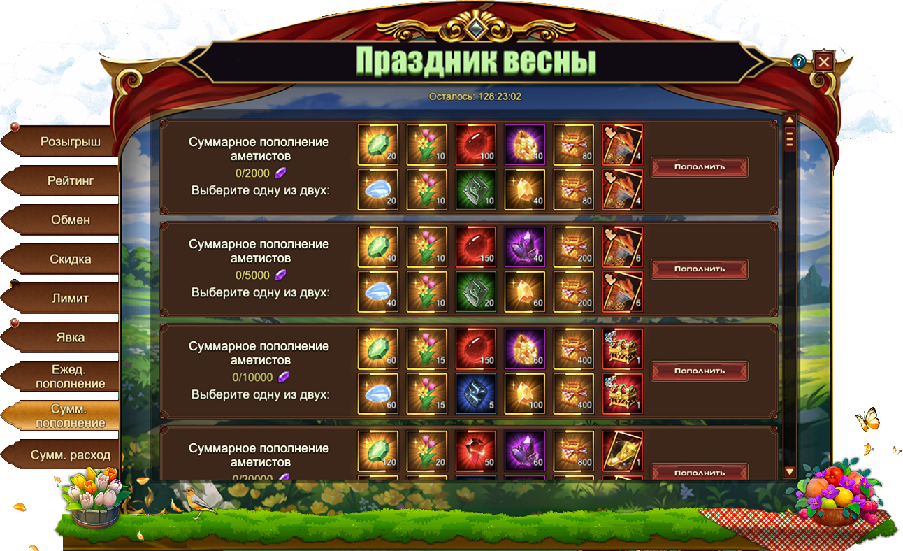 Обратите внимание, для активации скидки необходимо выполнить условие из первого столбца. Например, на скриншоте ниже, для приобретения со скидкой набора из 10 Букетов и 10 Корзинок необходимо пополнить счет на 1000.