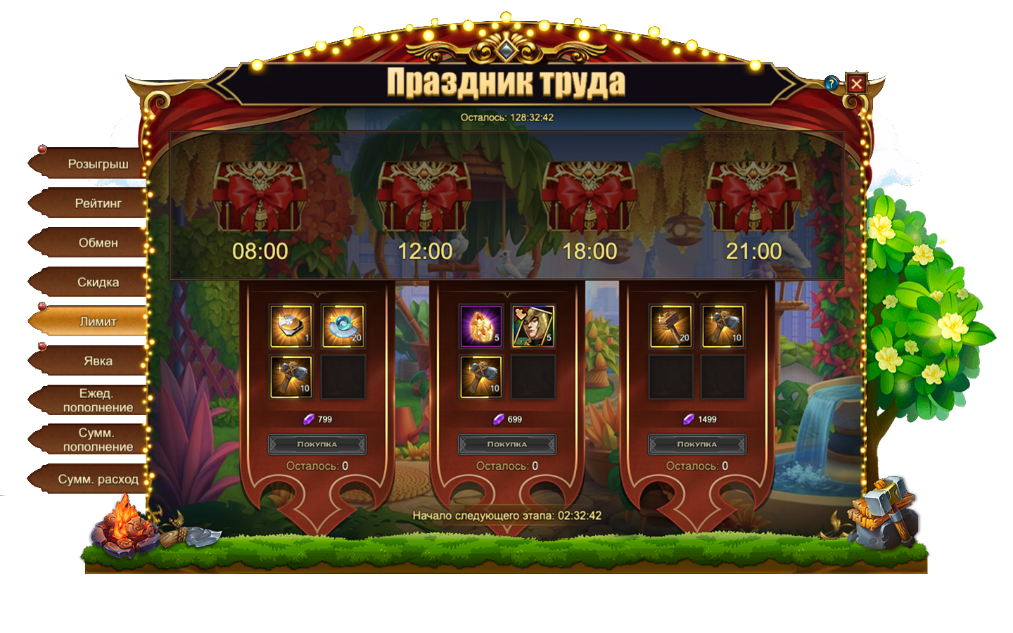 Здесь любопытные искатели приключений могут отыскать временные предложения, доступные в течение ограниченного времени и в ограниченном количестве. Группы товаров доступы с 8:00 до 11:59, с 12:00 до 17:59, с 18:00 до 20:59 и с 21:00 до 7:59. В этот раз вы можете получить в том числе: МолотокКиянка, Обучающее устройствоЯнтарь, Эссенция талисмана, [Фрагмент карты] Локи.