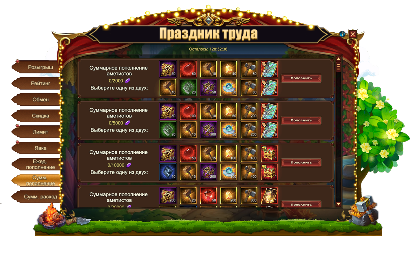 За пополнение счета на определенное количество аметистов за один день, вы можете получить: [Редк.] Стигмат, Изумруд, Сундук камней элементаля 4 ур., Сундук кристаллов 5 ур., Сундук самоцветов 6 ур., Киянка, Молоток, Дух крыльев святости, Сундук кристаллов 7 ур., Сундук кристаллов 9 ур., Сундук с эссенцией стигмата, Сущность артефакта, Сундук редкостей, Сундук с кодексом, Письмо с молитвой, Простой горн, Фрагмент Ядерного взрыва.