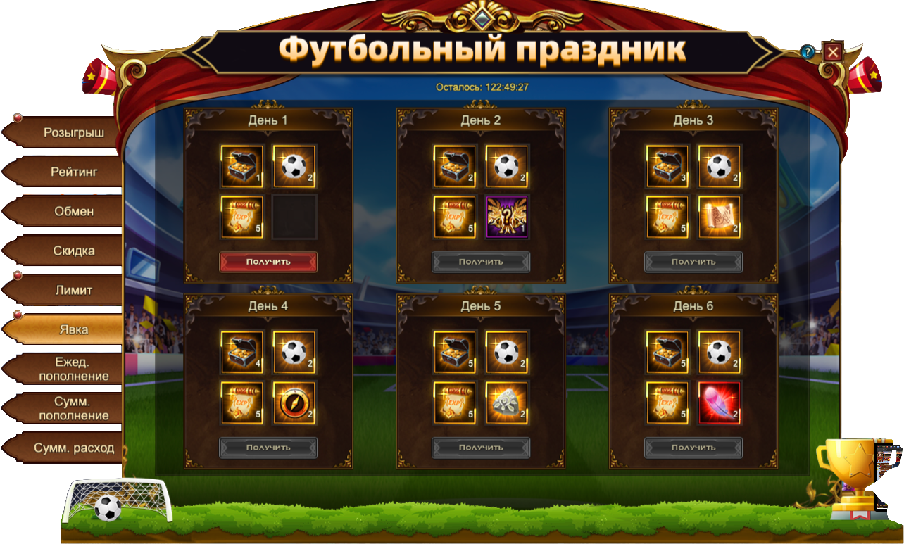 За посещение события ежедневно становятся доступны различные подарки. Например: Футбольный мячСумка золотаОранжевый свиток опыта, уникальный титул Несущийся по полюПотерянная картаПропуск на Арену, Оранжевый свиток опыта, Перо феникса и Свиток славы.