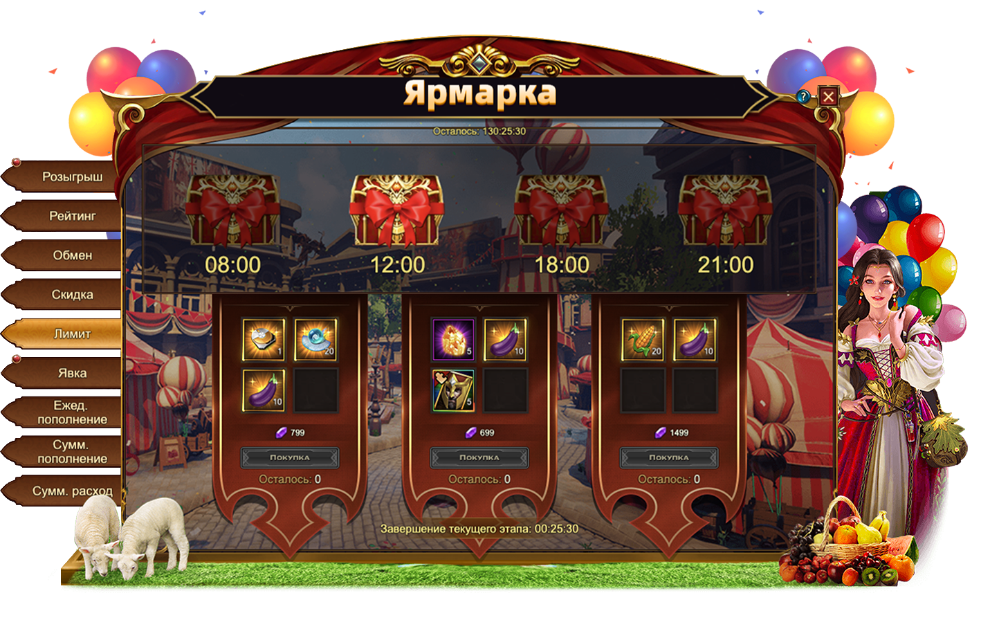 Здесь любопытные искатели приключений могут отыскать временные предложения, доступные в течение ограниченного времени и в ограниченном количестве. Группы товаров доступы с 8:00 до 11:59, с 12:00 до 17:59, с 18:00 до 20:59 и с 21:00 до 7:59. В этот раз вы можете получить в том числе: КукурузаБаклажанОбучающее устройствоЭссенция талисманаЯнтарь[Фрагмент Карты] Хеймдалль.