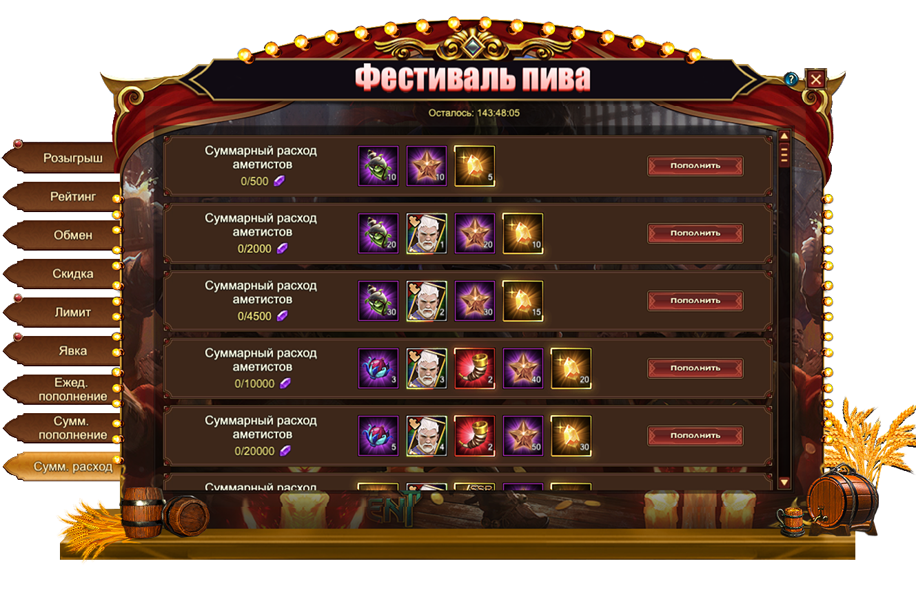 За пополнение счета на определенное количество аметистов за один день, вы можете получить: [Редк.] Стигмат, Сундук самоцветов 6 ур., Сундук кристаллов 5 ур., Сундук камней элементаля 4 ур., Камень усиления духа, [Героич.] Стигмат, Бочонок пива, Пиво, Цитрин, Сундук кристаллов 7 ур, Сундук кристаллов 9 ур., Сундук книг навыков, Сундук с эссенцией стигмата, Сущность артефакта, Сундук редкостей, Фрагмент меча бесконечности, Письмо с молитвой, Сундук карт UR, [Фрагмент карты] Тюр.