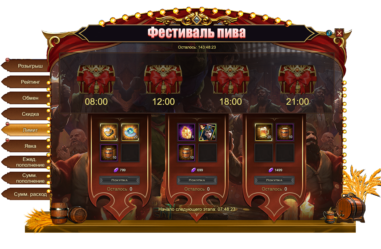 Здесь любопытные искатели приключений могут отыскать временные предложения, доступные в течение ограниченного времени и в ограниченном количестве. Группы товаров доступы с 8:00 до 11:59, с 12:00 до 17:59, с 18:00 до 20:59 и с 21:00 до 7:59. В этот раз вы можете получить в том числе: Бочонок пиваПивоОбучающее устройствоЭссенция талисманаЯнтарь[Фрагмент Карты] Брунгильда.