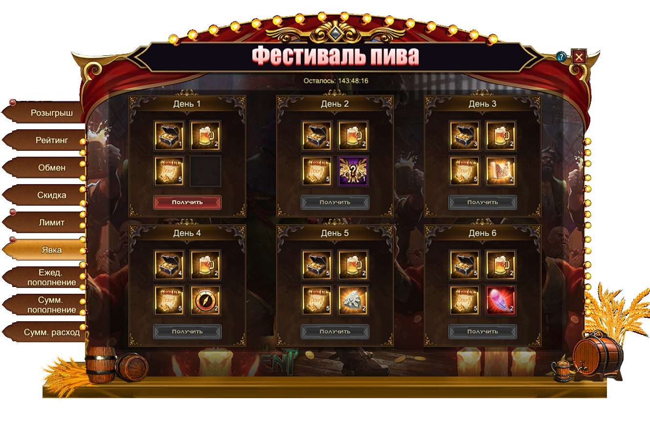 За посещение события ежедневно становятся доступны различные подарки. Например: Пиво, Оранжевый свиток опыта, уникальный титул КутилаПотерянная карта, Компас, Пропуск на Арену, Свиток славы, Перо феникса.
