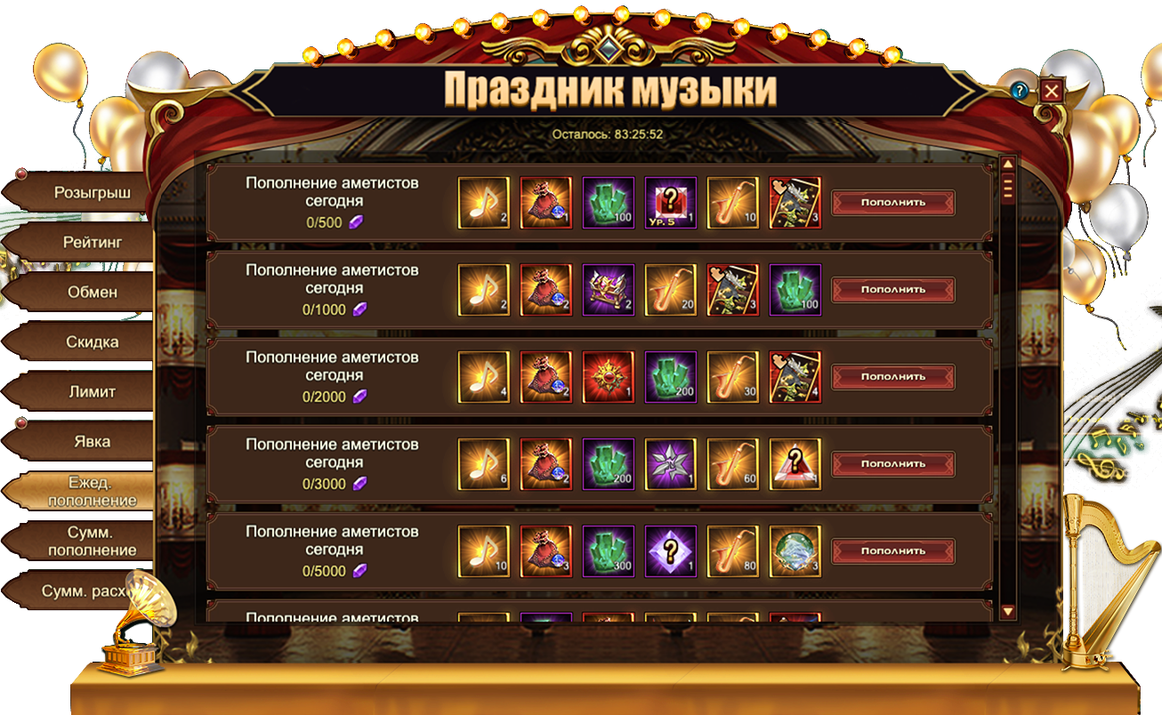 За пополнение счета на определенное количество аметистов за один день, вы можете получить: Изумруд[Героич.] СтигматСундук кристаллов 5 ур.Сундук камней элементаля 4 ур., НотаСаксофонДух крыльев святости, Сундук кристаллов 7 ур., Сундук снаряжения питомца (оранж.), Сундук снаряжения героя (оранж.), Сущность артефактаСундук редкостейСундук самоцветов 8 ур., Письмо с молитвой, Фрагмент гоблина.