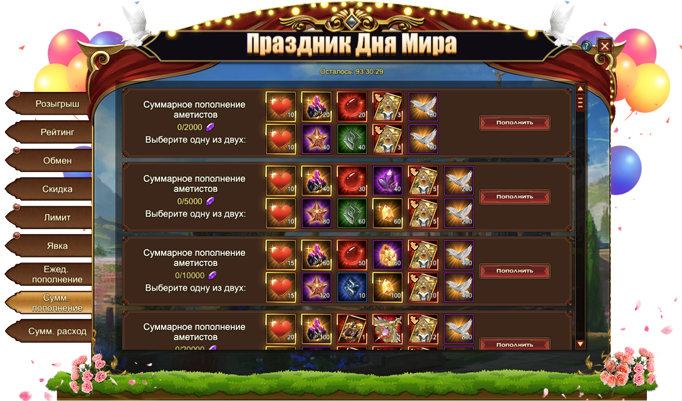 За пополнение счета на определенное количество аметистов за один день, вы можете получить: Изумруд, Сундук кристаллов 5 ур., Сундук самоцветов 6 ур., Сундук камней элементаля 4 ур., Голубь мираЖетон дня мира, Сундук книг навыковСундук кристаллов 7 ур., Дух крыльев святости, Сундук кристаллов 9 ур., Оранжевое созвездие, Сундук снаряжения героя (оранж.), Сущность артефактаСундук редкостей, Письмо с молитвой, Фрагмент паровой стрекозы, Эмблема величия, [Фрагмент карты] Тюр.