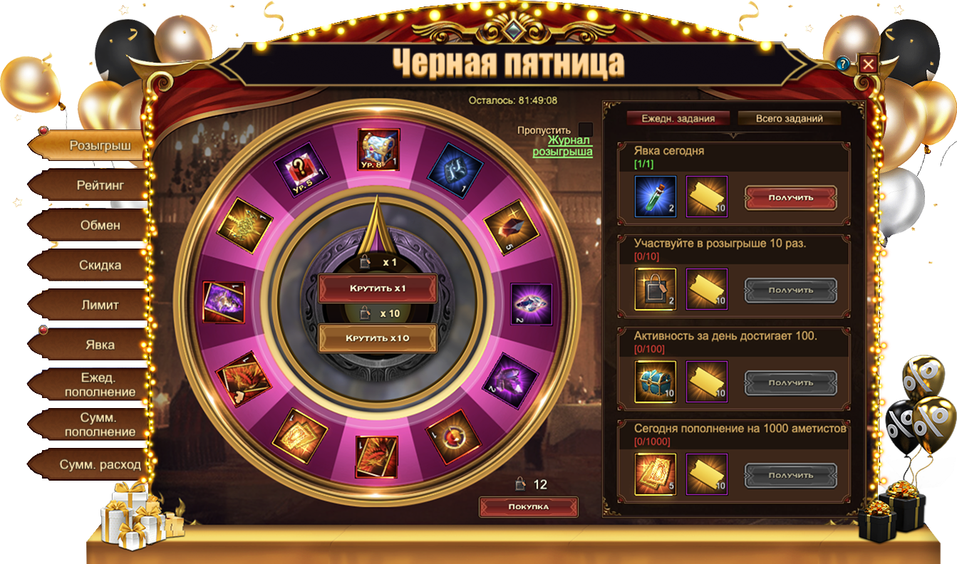 Участвуйте в розыгрыше различных ценных предметов, чтобы получить: Рутил, Мрачные одежды, Чароит, Сундук кристаллов 5 ур., Свиток славы, Знак разрушения, Кристалл чар демона, Кристалл души крыльев, Череп ужаса, Сундук самоцветов 8 ур., Фрагмент крыльев фантома и даже Крылья фантома целиком!