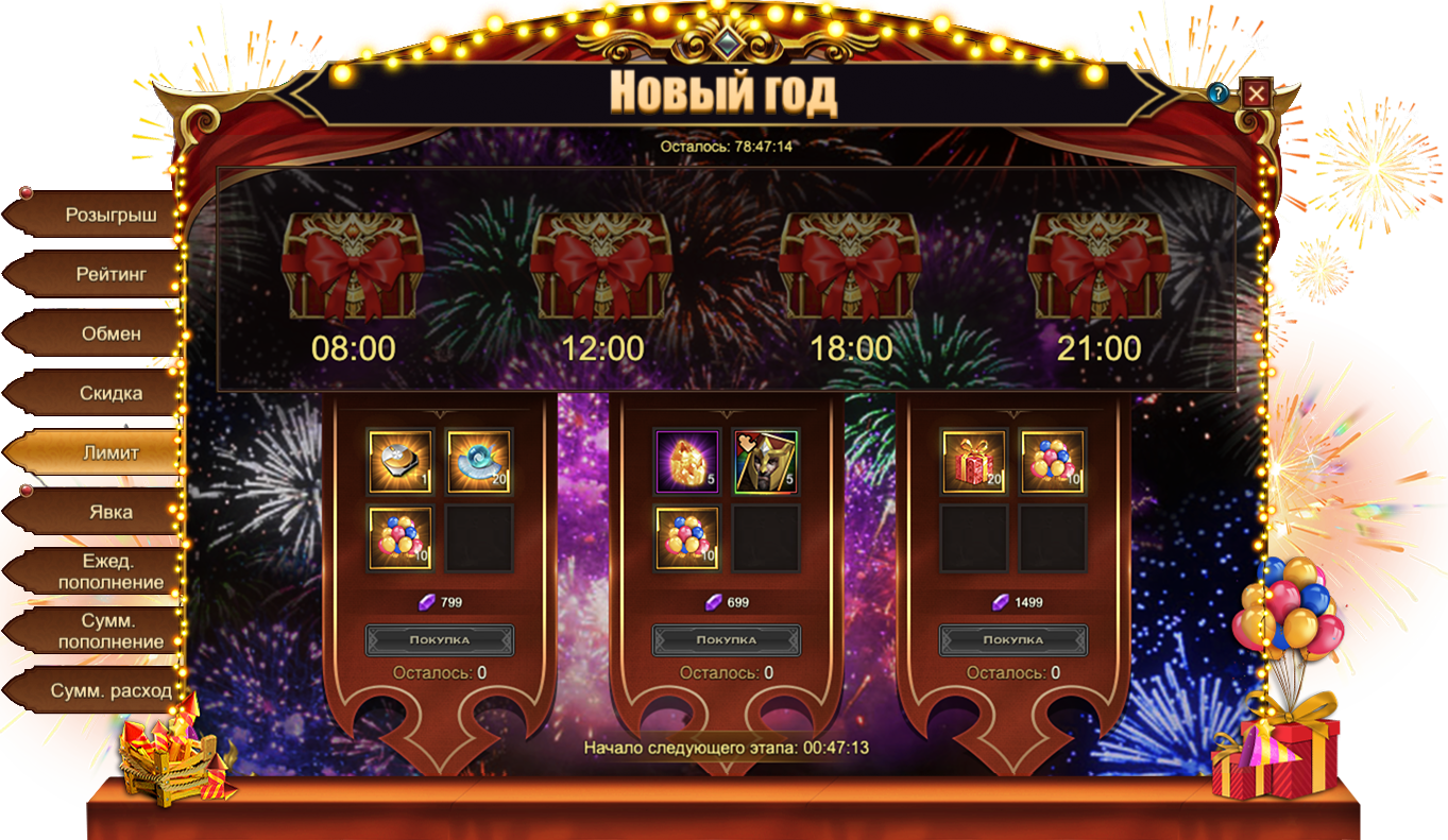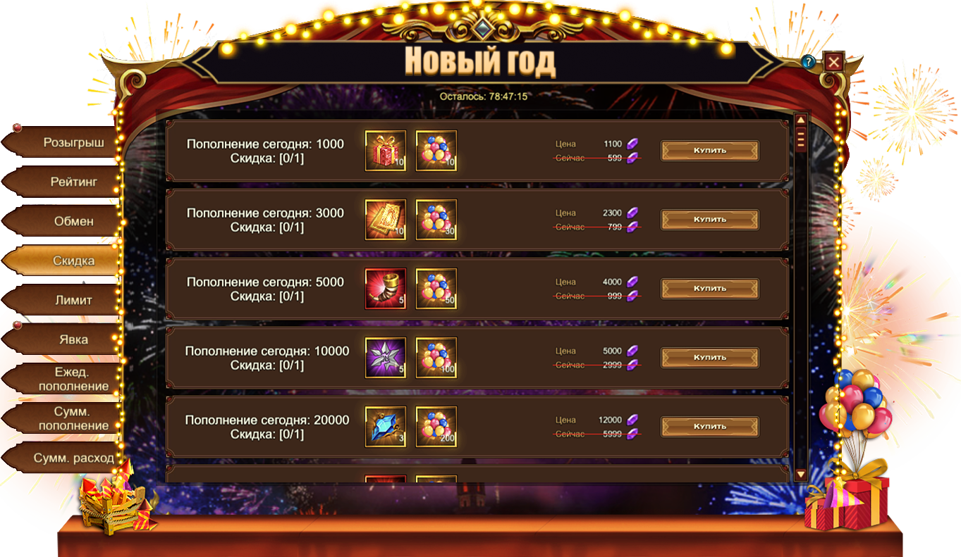 Обратите внимание, для активации скидки необходимо выполнить условие из первого столбца. Например, на скриншоте ниже, для приобретения со скидкой набора из 10 Коробок сюрпризов и 10 Шариков необходимо пополнить счет на 1000.