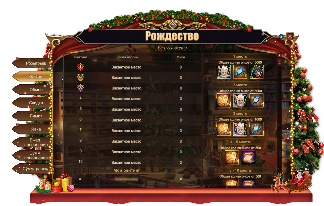 Участвуйте в розыгрыше различных ценных предметов, чтобы получить: ЧароитСундук самоцветов 6 ур., Сундук кристаллов 5 ур.Свиток славы, Кристалл повышения богини, Кольцо господства, Сундук героя 2, Крылья степиФрагмент Рождественских саней и даже восхитительные Рождественские сани целиком!
