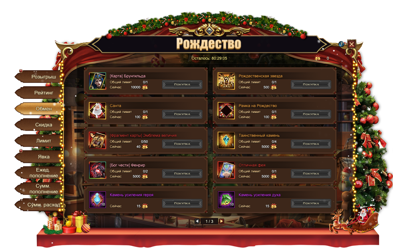 Шарики, собранные во время данного Фестиваля, позволяют приобрести множество интересных предметов, в том числе и эксклюзивных для данного события: [Карта] Брунгильда, Особый титул Рождественская звезда[Аватар] СантаРамка на Рождество[Фрагмент карты] Эмблема величия. Если эксклюзивные предметы вас не интересуют, всегда можно обменять колокольчики на полезные ресурсы. Например, на Таинственный каменьОтличная фея или [Бог чести] Фенрир