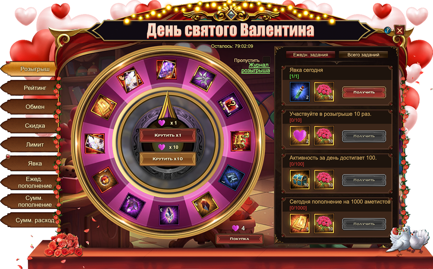 За выполнение ежедневных заданий вы тоже можете получить разнообразные ценности: Малое зелье энергииБукет розСердечкиОсобый сундук материалов или Свиток славы.