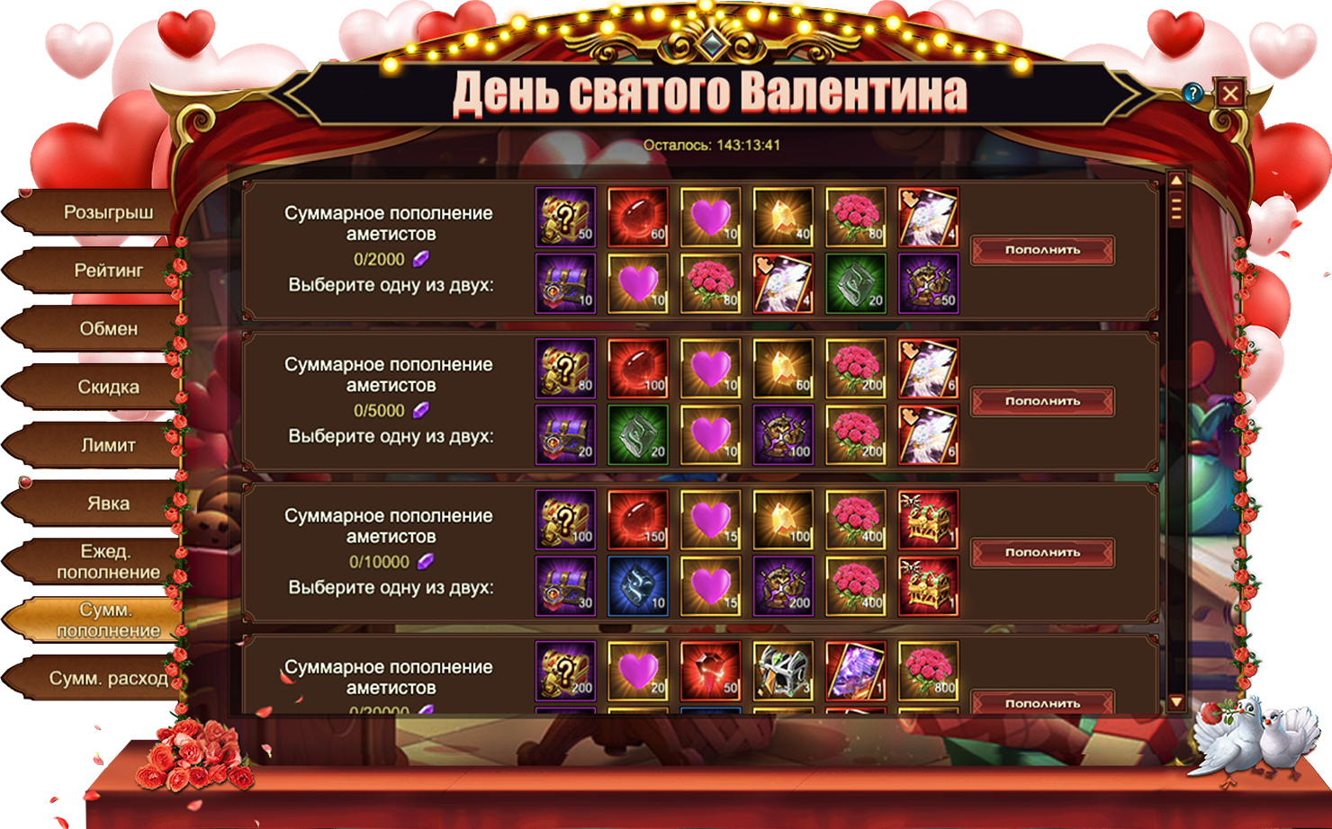 Обратите внимание, для активации скидки необходимо выполнить условие из первого столбца. Например, на скриншоте ниже, для приобретения со скидкой набора из 10 Сердечек и 10 Букетов роз необходимо пополнить счет на 1000.