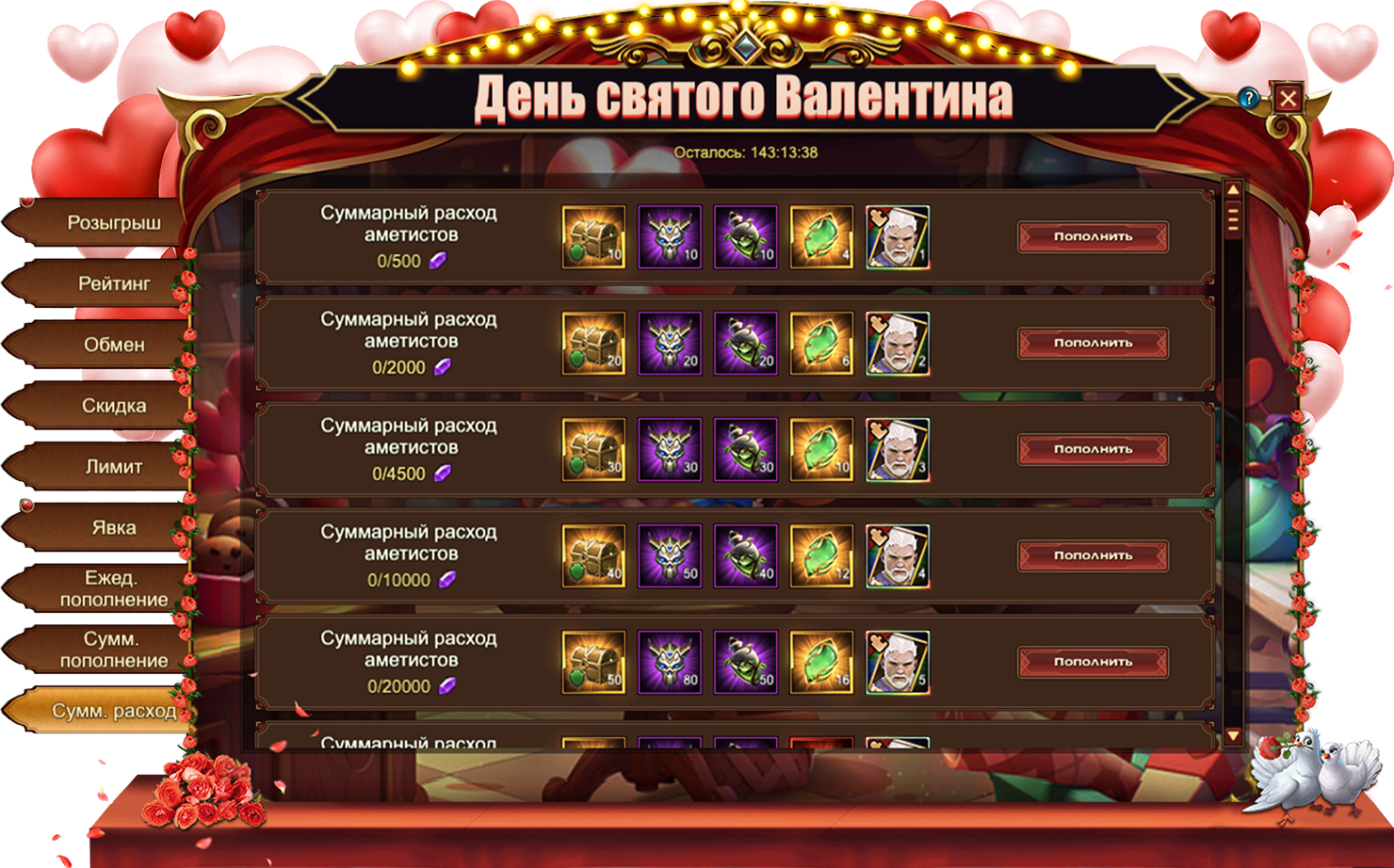 За пополнение счета на определенное количество аметистов за один день, вы можете получить: Изумруд, Сундук кристаллов 5 ур., Сундук камней элементалей 4 ур., [Героич.] Стигмат, Сердечки, Букет Роз, Дух крыльев святости, Песок темной звезды, Сундук кристаллов 7 ур., Сундук снаряжения питомца (оранж.), Сундук снаряжения героя (оранж.), Знак разрушения, Сущность артефакта, Сундук редкостей, Письмо с молитвой, Фрагмент крыльев купидона, Сундук самоцветов 8 ур., [Фрагмент Карты] Тюр!