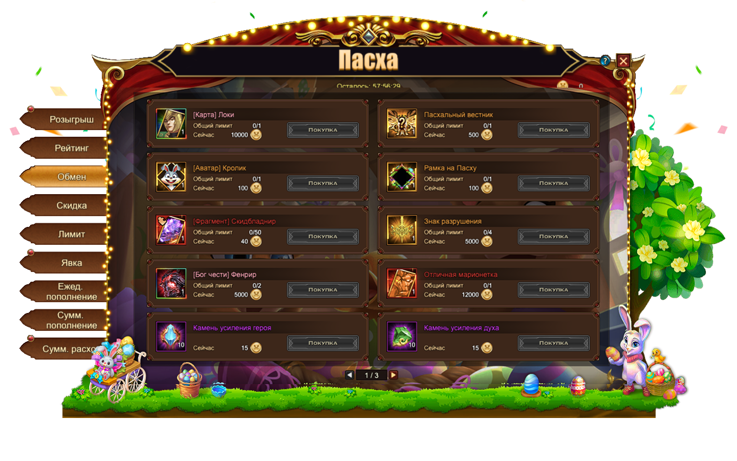 Корзинки, собранные во время данного Фестиваля, позволяют приобрести множество интересных предметов, в том числе и эксклюзивных для данного события: [Карта] Локи, титул Пасхальный Вестник[Аватар] КроликРамка на Пасху. Если эксклюзивные предметы вас не интересуют, всегда можно обменять Кроличьи монеты на полезные ресурсы. Например, на Знак разрушения, [Бог чести] Фенрир или Отличная марионетка.