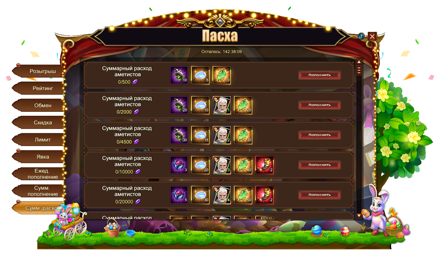 За пополнение счета на определенное количество аметистов за один день, вы можете получить: [Редк.] Стигмат, Сундук камней элементаля 4 ур., Сундук кристаллов 5 ур., Сундук самоцветов 6 ур., [Героич.] Стигмат, Праздничное яйцо, Кроличья монета, Эссенция талисмана, Сундук книг навыков, Сундук кристаллов 7 ур., Сундук кристаллов 9 ур., Сундук с эссенцией стигмата, Сущность артефакта, Сундук редкостейПисьмо с молитвойФрагмент гоблинаСундук карт UR, [Фрагмент карты] Тюр.