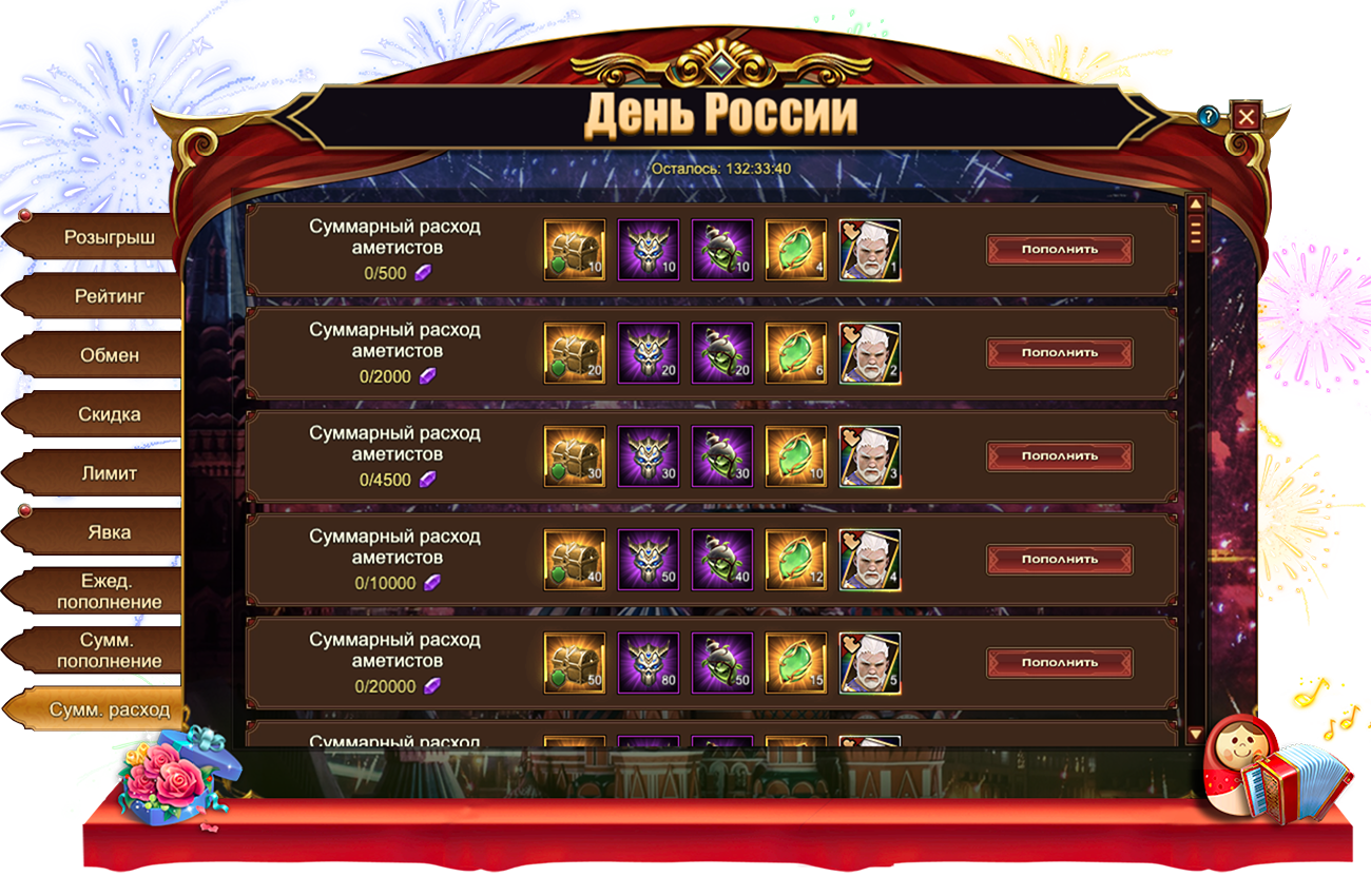За пополнение счета на определенное количество аметистов за один день, вы можете получить: [Редк.] СтигматИзумруд, Сундук кристаллов 5 ур.Сундук камней элементаля 4 ур., Сундук самоцветов 6 ур., День России тортМедвежонок, Дух крыльев святости, Сундук с эссенцией стигмата, Сундук кристаллов 9 ур.Сундук кристаллов 7 ур., Сущность артефактаДух крыльев святостиФрагмент паука, Сундук редкостей, Сундук с кодексом, Письмо с молитвой, Простой горн[Фрагмент карты] Тюр.