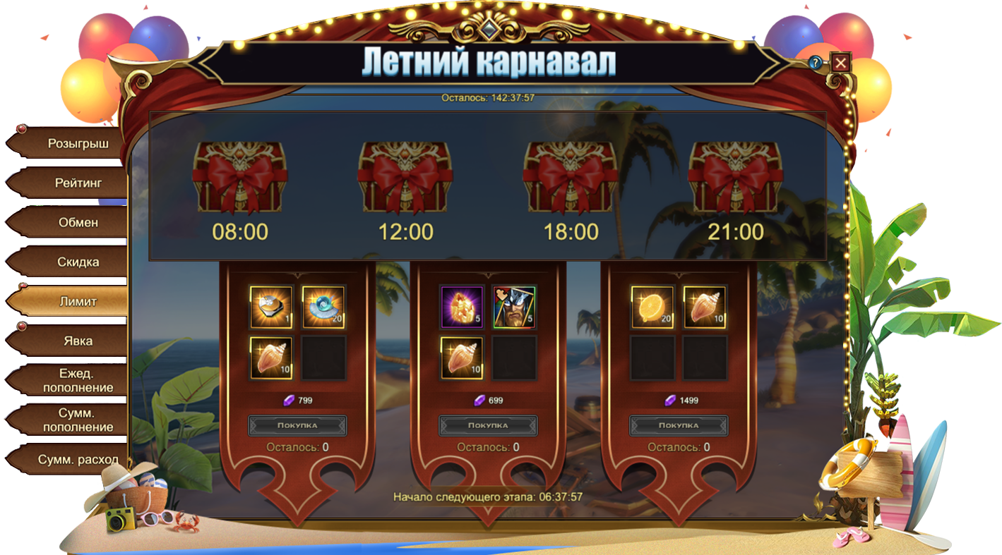 Обратите внимание, для активации скидки необходимо выполнить условие из первого столбца. Например, на скриншоте ниже, для приобретения со скидкой набора из 10 Апельсинов и 10 Морских раковин необходимо пополнить счет на 1000.