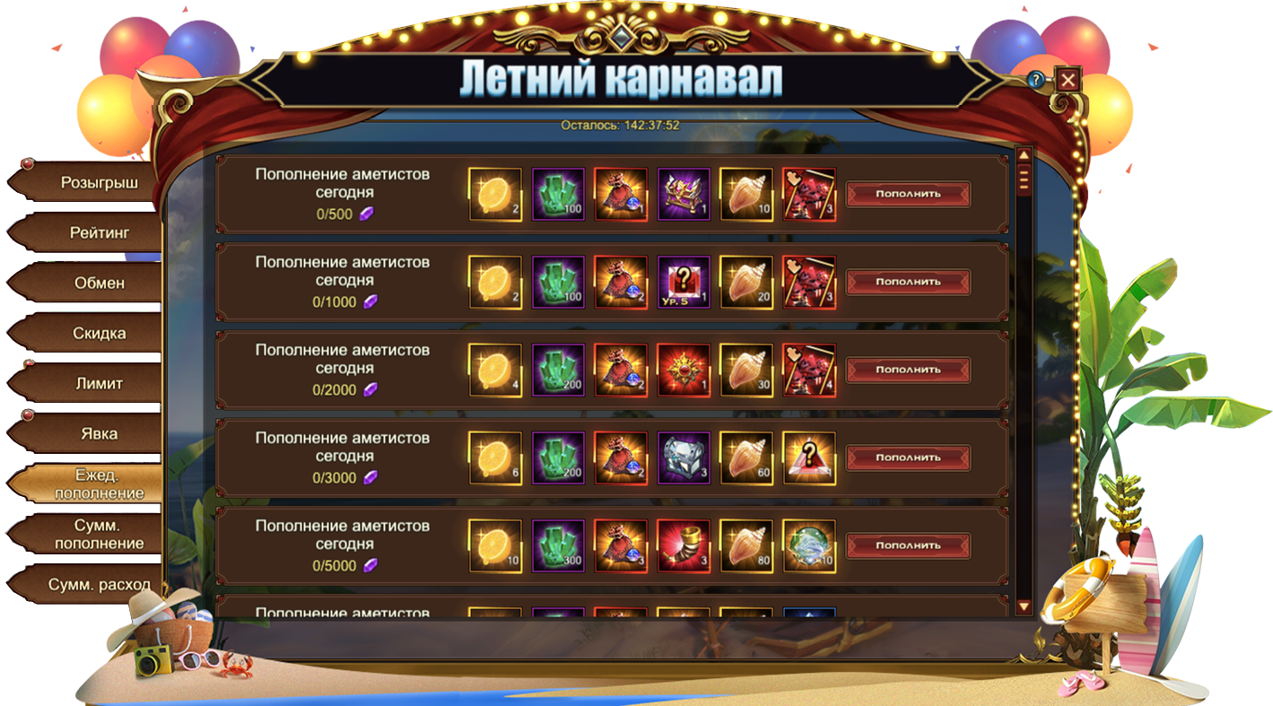 За пополнение счета на определенное количество аметистов за один день, вы можете получить: [Редк.] Стигмат, Сундук кристаллов 5 ур., Сундук камней элементаля 4 ур., Сундук самоцветов 6 ур., Изумруд, Апельсин, Морская раковина, Дух крыльев святости, Сундук кристаллов 7 ур., Сундук кристаллов 9 ур., Сундук с эссенцией стигмата, Сущность артефактаПисьмо с молитвой, Сундук редкостей, Сундук с кодексом, Простой горн, [Фрагмент карты] Тюр.