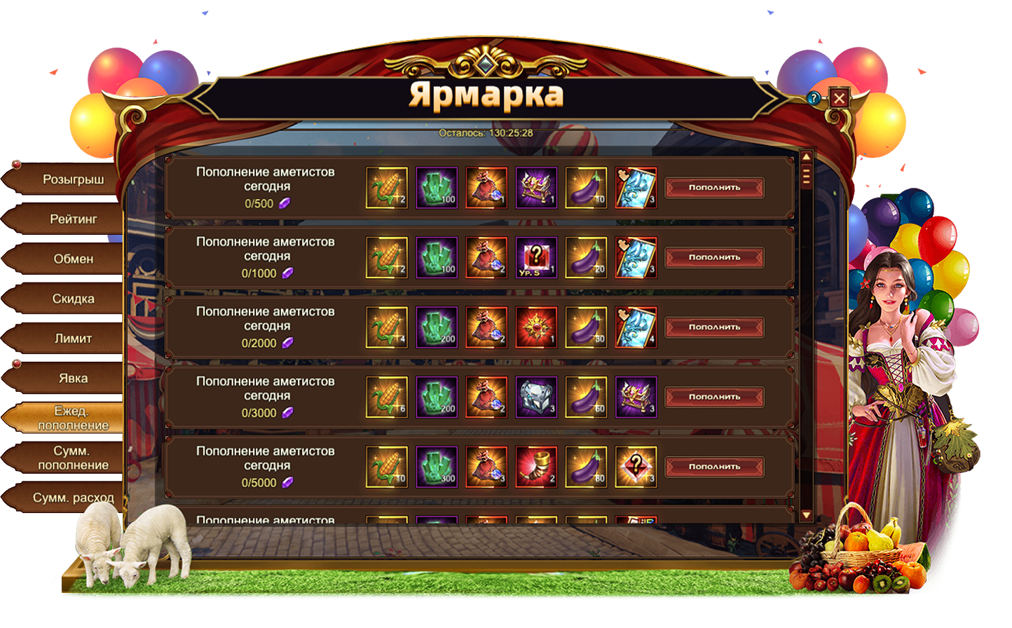 За пополнение счета на определенное количество аметистов за один день, вы можете получить: Изумруд, Сундук кристаллов 5 ур.Сундук камней элементаля 4 ур., Сундук самоцветов 6 ур., КукурузаБаклажан, Сундук кристаллов 9 ур., Сундук с эссенцией стигмата, Сущность артефактаПисьмо с молитвой, Простой горн, Сундук карт UR, Сундук снаряжения героя (красн.), Сундук редкостей, Фрагмент голубого крыла, [Фрагмент карты] Тюр.