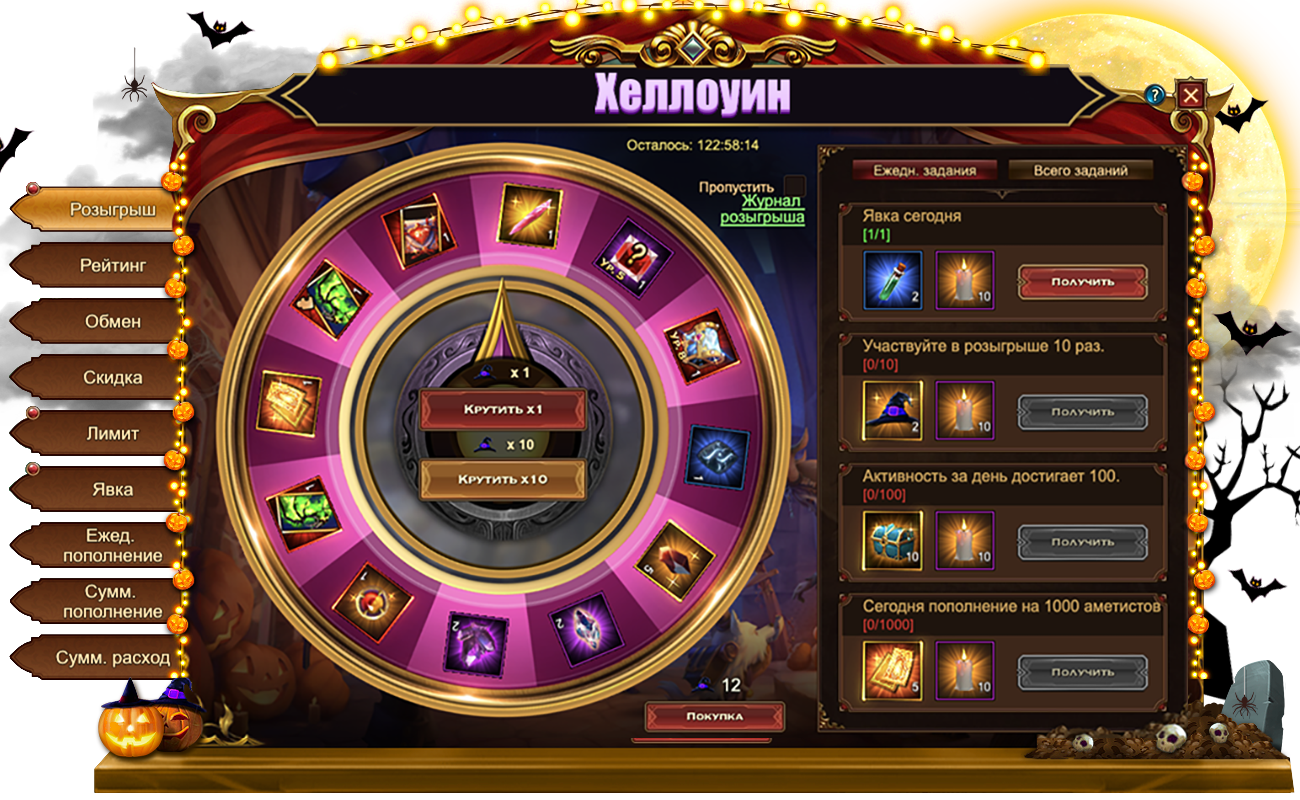 За пополнение счета на определенное количество аметистов за один день, вы можете получить: Сундук кристаллов 5 ур.Сундук камней элементаля 4 ур., СвечаВедьмина шляпа, Душа облика, Дух крыльев святости, Сундук кристаллов 7 ур.Сундук снаряжения питомца (оранж.)Сундук снаряжения героя (оранж.)Сундук книг навыковТурмалин, Сущность артефактаСундук редкостей, Письмо с молитвами, [Фрагмент] Волшебная метла, [Фрагмент карты] Тюр.