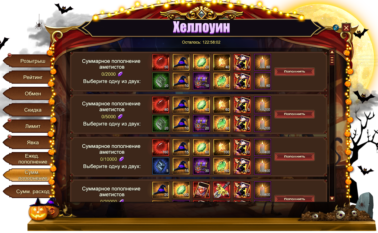 Обратите внимание, для активации скидки необходимо выполнить условие из первого столбца. Например, на скриншоте ниже, для приобретения со скидкой набора из 10 Ведьминых шляп и 10 Свечей необходимо пополнить счет на 1000.