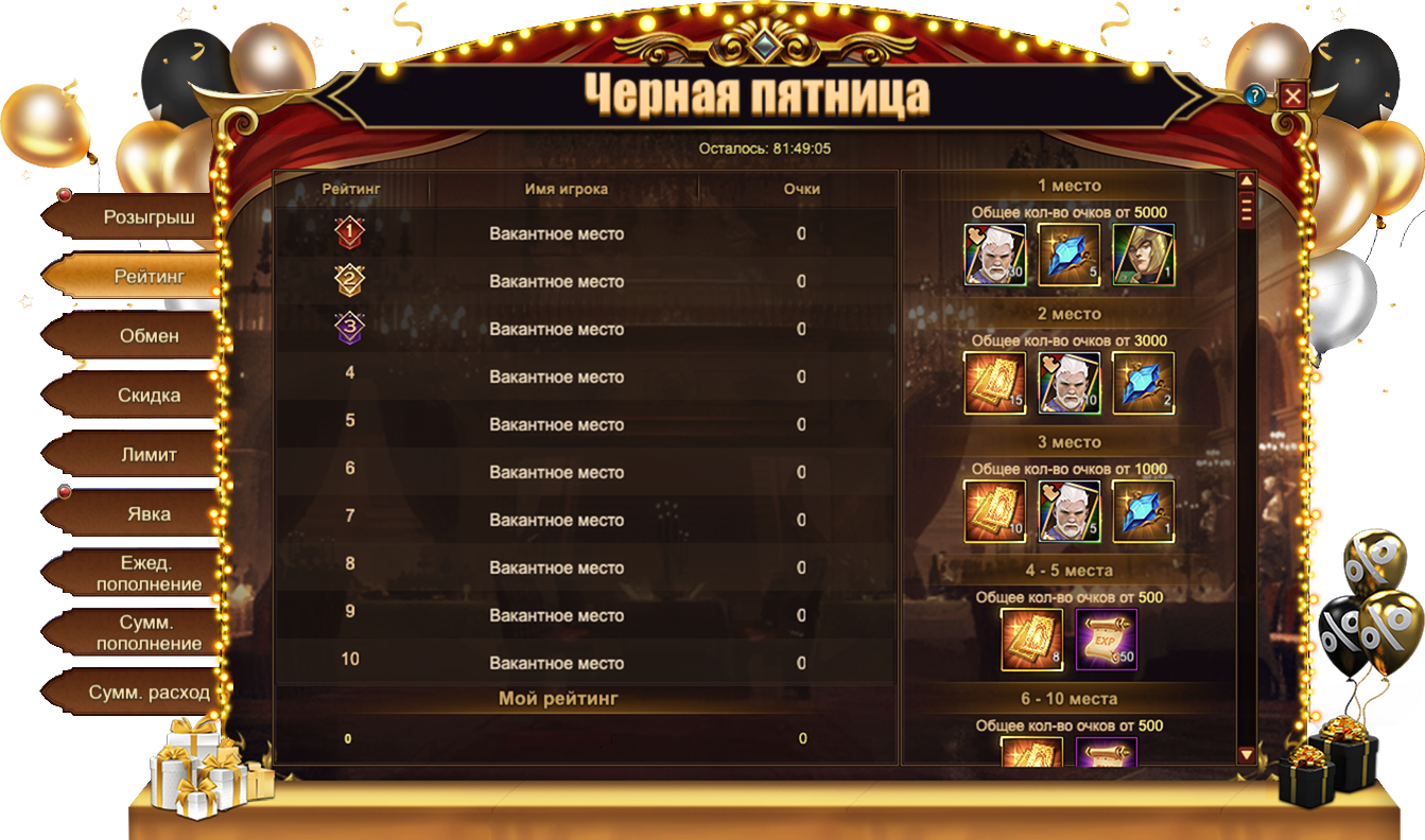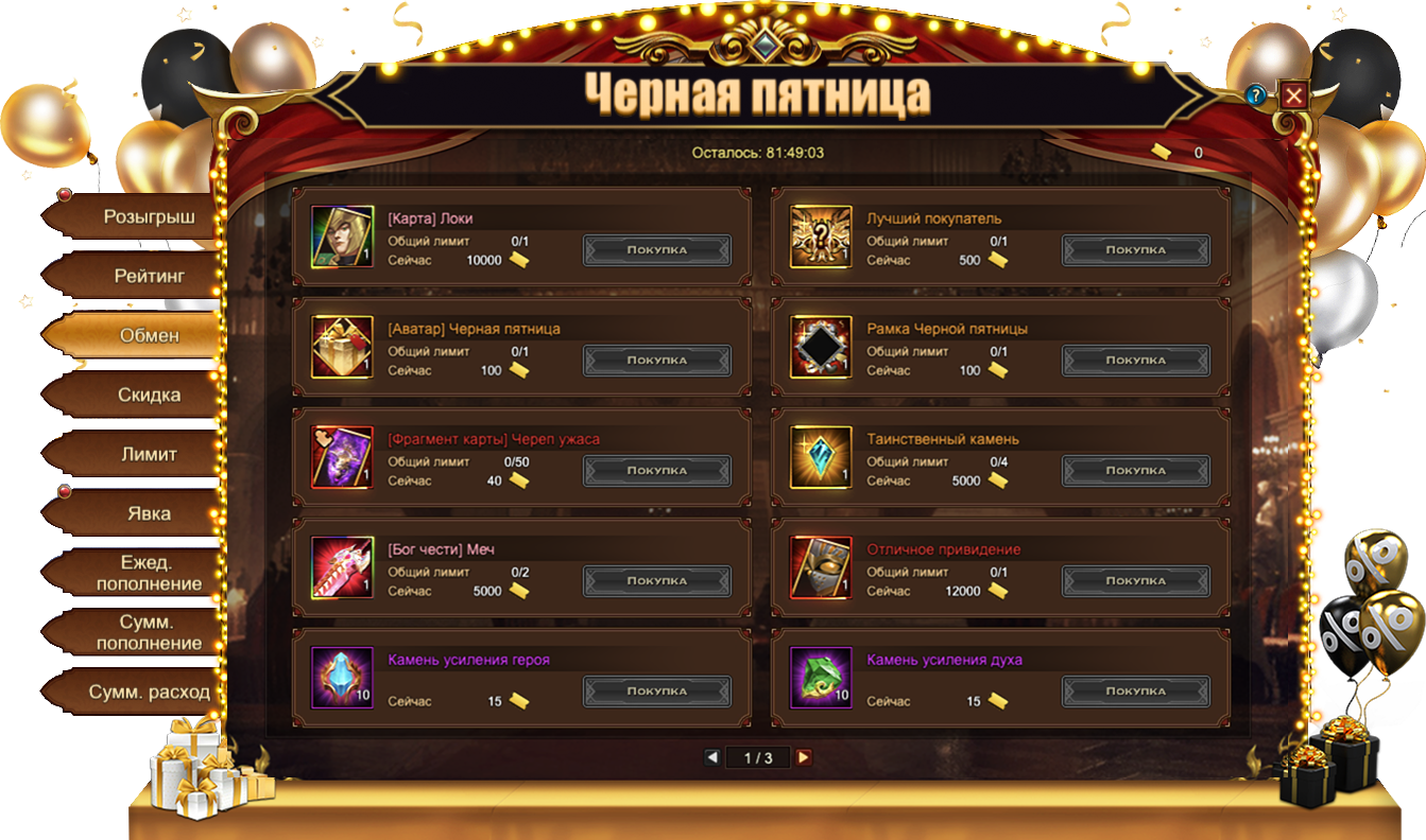 Купоны, собранные во время данного Фестиваля, позволяют приобрести множество интересных предметов, в том числе и эксклюзивных для данного события: [Карта] Локи, Особый титул Лучший покупатель[Аватар] Черная пятницаРамка Черной пятницы[Фрагмент карты] Череп ужаса. Если эксклюзивные предметы вас не интересуют, всегда можно обменять купоны на полезные ресурсы. Например, на Таинственный камень, Отличное приведение или [Бог чести] Меч
