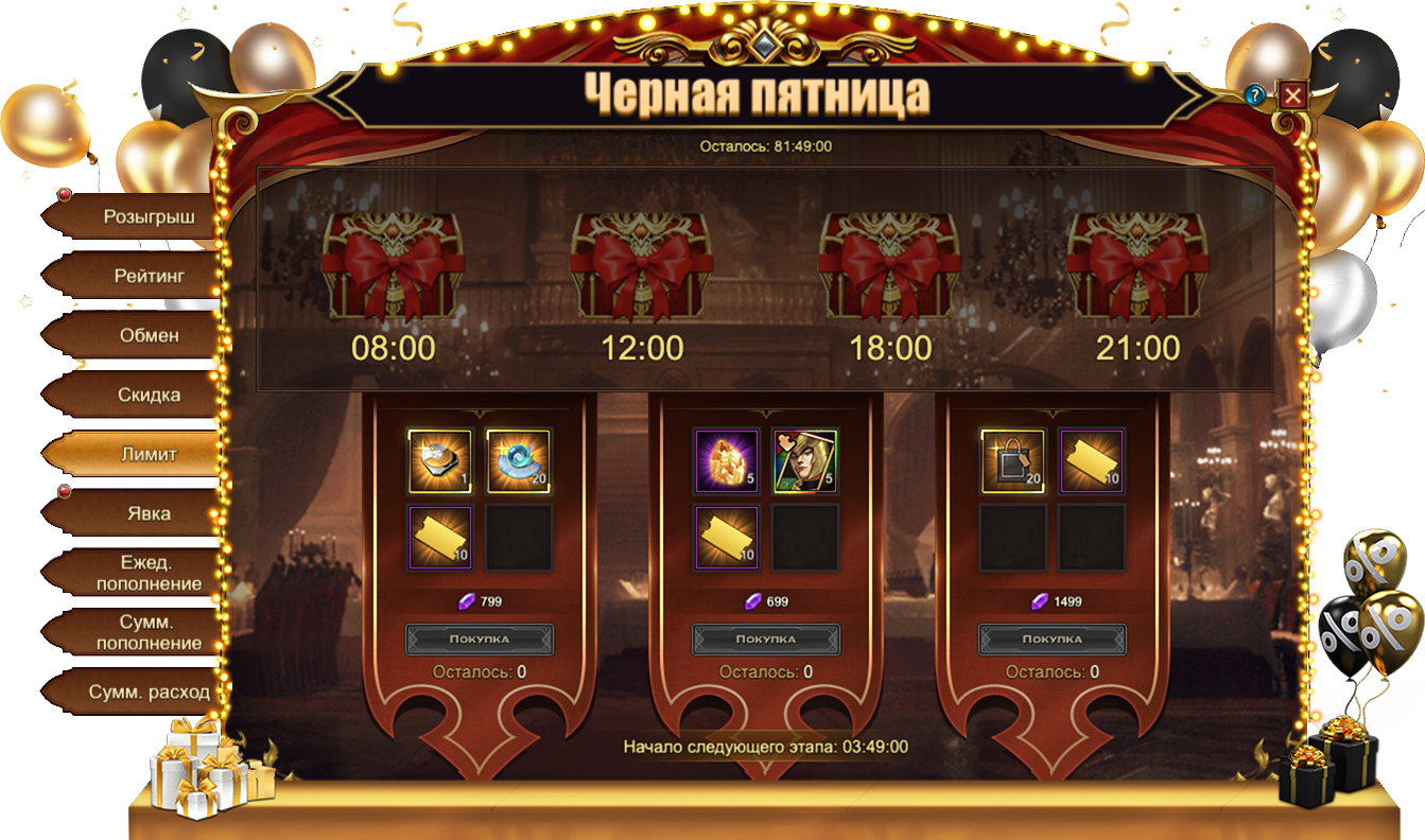 Здесь любопытные искатели приключений могут отыскать временные предложения, доступные в течение ограниченного времени и в ограниченном количестве. Группы товаров доступы с 8:00 до 11:59, с 12:00 до 17:59, с 18:00 до 20:59 и с 21:00 до 7:59. В этот раз вы можете получить в том числе: КупонПакетОбучающее устройствоЭссенция талисманаЯнтарь[Фрагмент Карты] Локи.