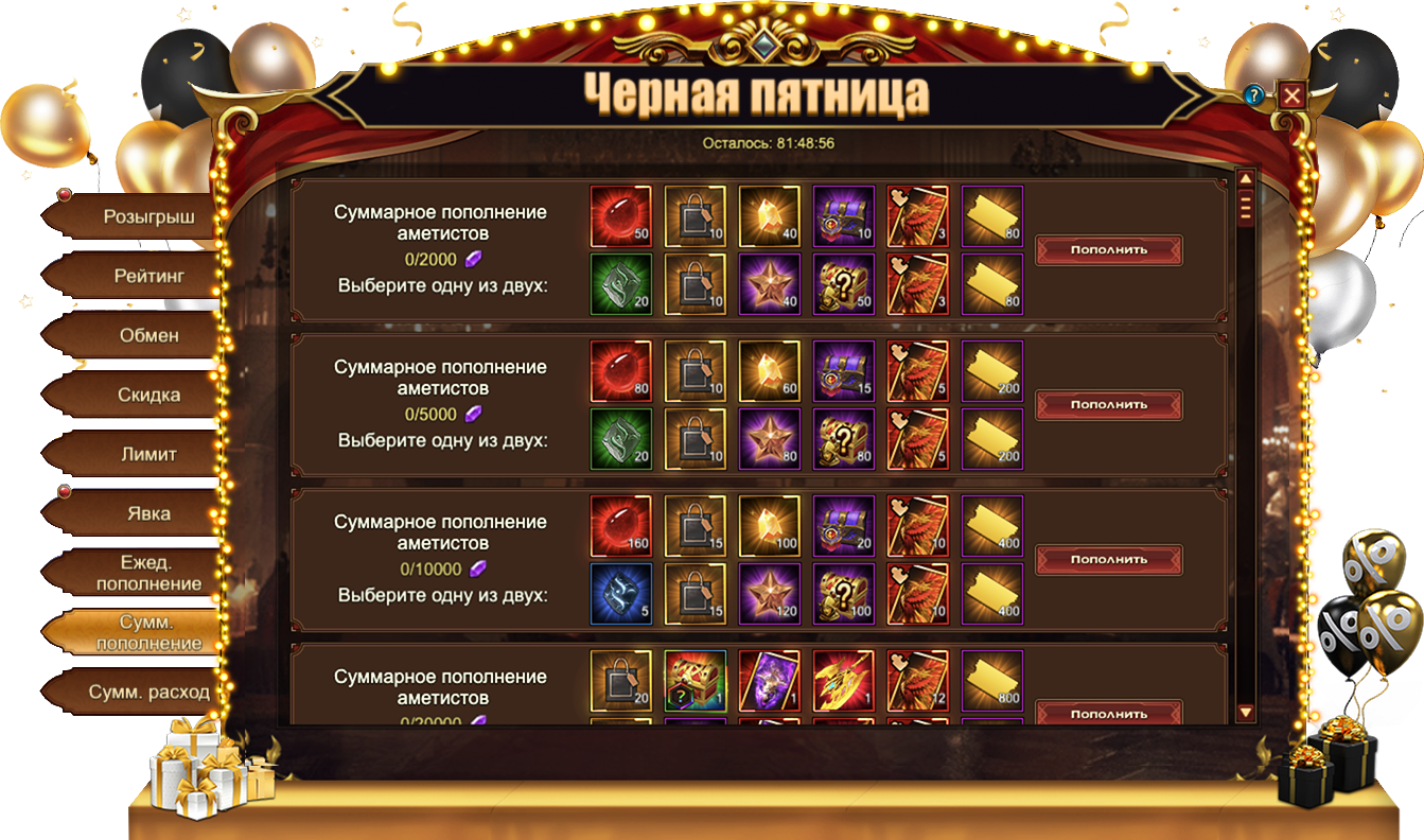 За пополнение счета на определенное количество аметистов за один день, вы можете получить: Сундук кристаллов 5 ур.Сундук камней элементаля 4 ур., [Героич.] Стигмат, КупонПакет, Цитрин, Песок темной звезды, Сундук кристаллов 9 ур., Сундук книг навыков, Кольцо господства, Сундук снаряжения питомца (оранж.)Сундук редкостейПисьмо с молитвой, Сундук самоцветов 8 ур., Сундук снаряжения героя (красн.), Сундук снаряжения скакуна (красн.).