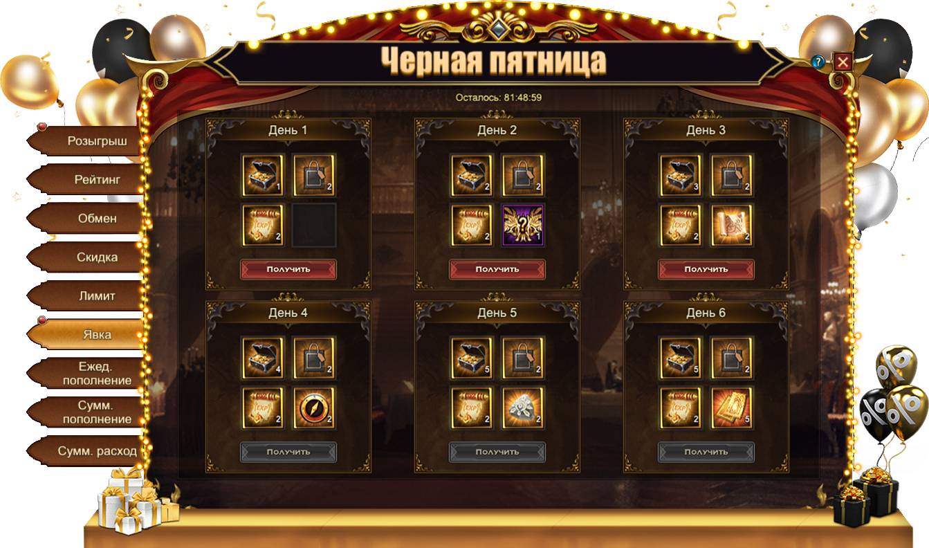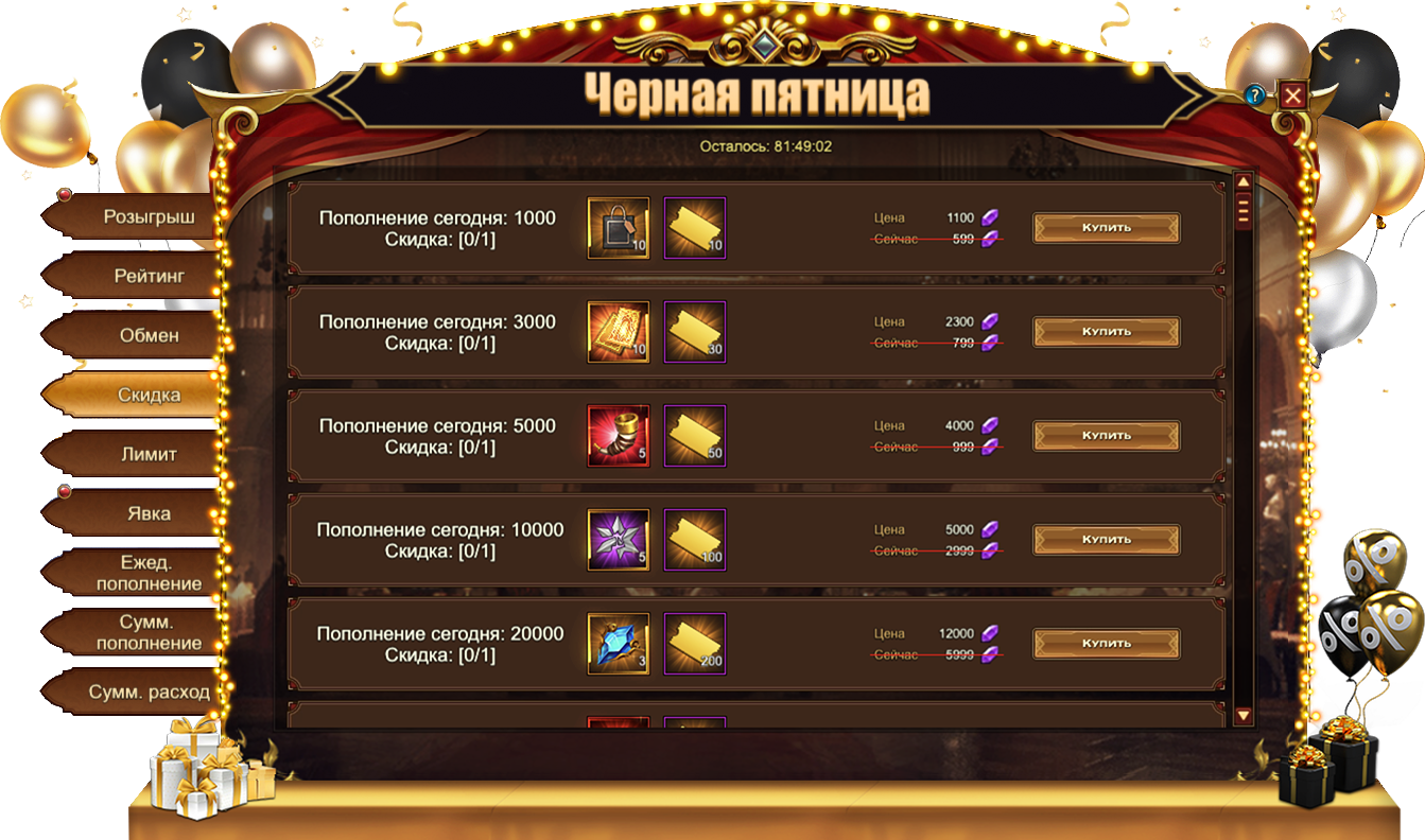 Купоны, собранные во время данного Фестиваля, позволяют приобрести множество интересных предметов, в том числе и эксклюзивных для данного события: [Карта] Локи, Особый титул Лучший покупатель[Аватар] Черная пятницаРамка Черной пятницы[Фрагмент карты] Череп ужаса. Если эксклюзивные предметы вас не интересуют, всегда можно обменять купоны на полезные ресурсы. Например, на Таинственный камень, Отличное приведение или [Бог чести] Меч