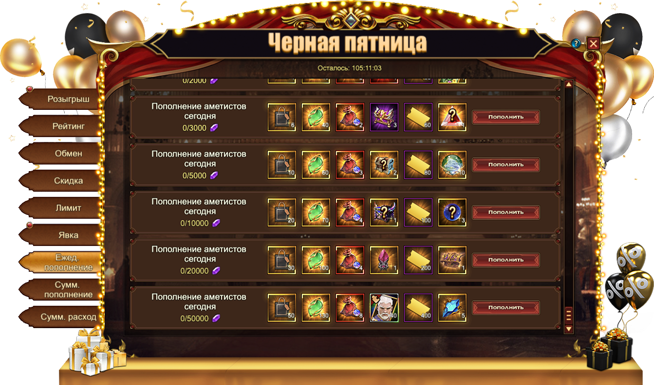 За пополнение счета на определенное количество аметистов за один день, вы можете получить: Сундук кристаллов 5 ур.Сундук камней элементаля 4 ур., [Героич.] Стигмат, КупонПакет, Цитрин, Песок темной звезды, Сундук кристаллов 9 ур., Сундук книг навыков, Кольцо господства, Сундук снаряжения питомца (оранж.)Сундук редкостейПисьмо с молитвой, Сундук самоцветов 8 ур., Сундук снаряжения героя (красн.), Сундук снаряжения скакуна (красн.).