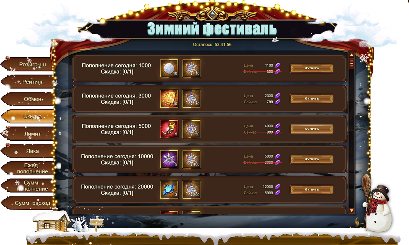 Обратите внимание, для активации скидки необходимо выполнить условие из первого столбца. Например, на скриншоте ниже, для приобретения со скидкой набора из 10 Снежинок и 10 Снежков необходимо пополнить счет на 1000.