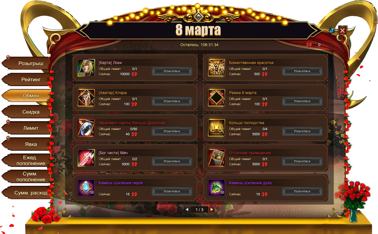 Банты, собранные во время данного Фестиваля, позволяют приобрести множество интересных предметов, в том числе и эксклюзивных для данного события: [Карта] Локи, титул Божественная красотка[Аватар] КлараРамка 8 марта. Если эксклюзивные предметы вас не интересуют, всегда можно обменять Букеты на полезные ресурсы. Например, на Отличное приведение, Кольцо господства и [Бог чести] Меч.