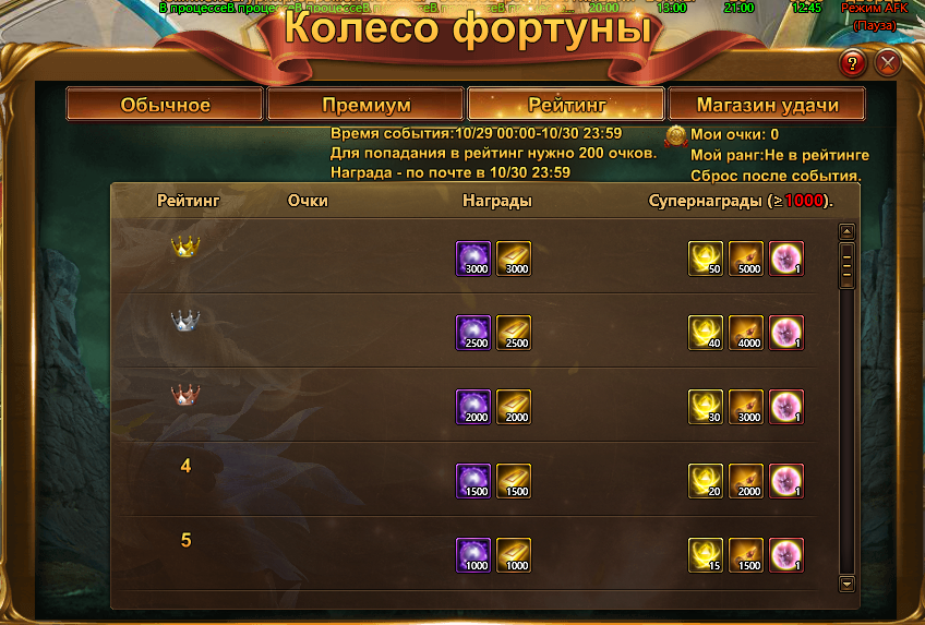 Чтобы набирать очки в «Магнате» было проще, ангелы открыли для вас событие «Колесо фортуны». 29 и 30 октября вращайте волшебное колесо и получайте полезные ресурсы и предметы — солнечники, астральные слитки, лазуриты, камни печати, свитки пробуждения, а также призовые купоны. Участники, попавшие в топ-10 рейтинга события и набравшие от 1000 очков, смогут получить великую душу Царя драконов.